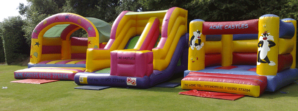 Our inflatables are available for hire indoors and outdoors for almost any event including children's & adult parties, schools, nurseries, church events, rallies, fetes, functions, fund-raising, scouts, guides, youth clubs and many more special occasions. Whether it is an Obstacle Course, Family Castle, Sumo Suits, Bouncy Boxing Ring, Superslide or just a small childrens inflatable Acme Castles has it all.
