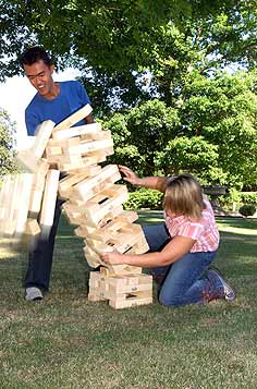 GIANT TUMBLE TOWER (JENGA) The classic garden game of skill and cunning. Build up the tower, then take it in turns to remove a piece and add it to the top without making the whole tower tumble. With 58 solid wooden blocks, Tumble-Tower builds from approx. 0.9m (3ft 6ins) at the start of the game to 1.5m (5ft) max in play. Hire this game for just £10 when you book any inflatable or party marquee. |